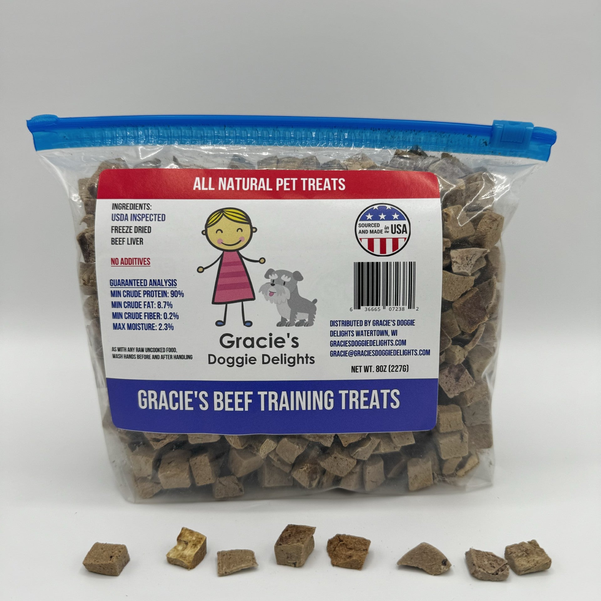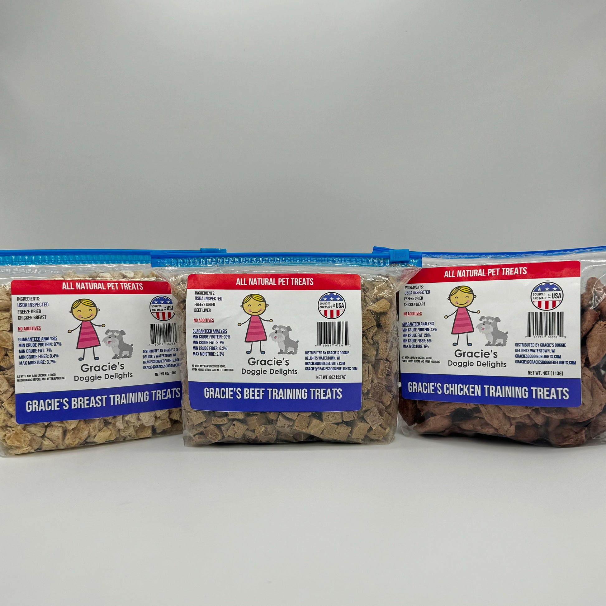 As with all our treats, Gracie's Training treats are made with one ingredient, Freeze Dried USDA Inspected Meat and are freeze dried raw with no additives. The slow freeze drying process locks in the delicious flavor that pets crave with no grains, gluten, chemicals or preservatives. It's a raw food treat without the mess. They're the treats pets love and you'll love giving.